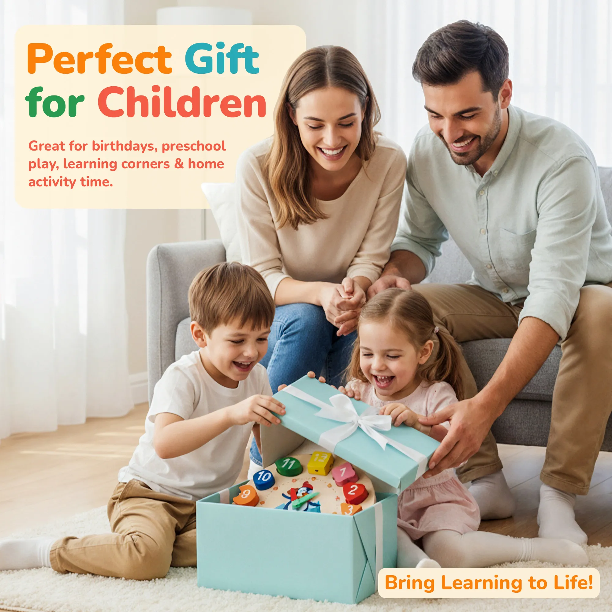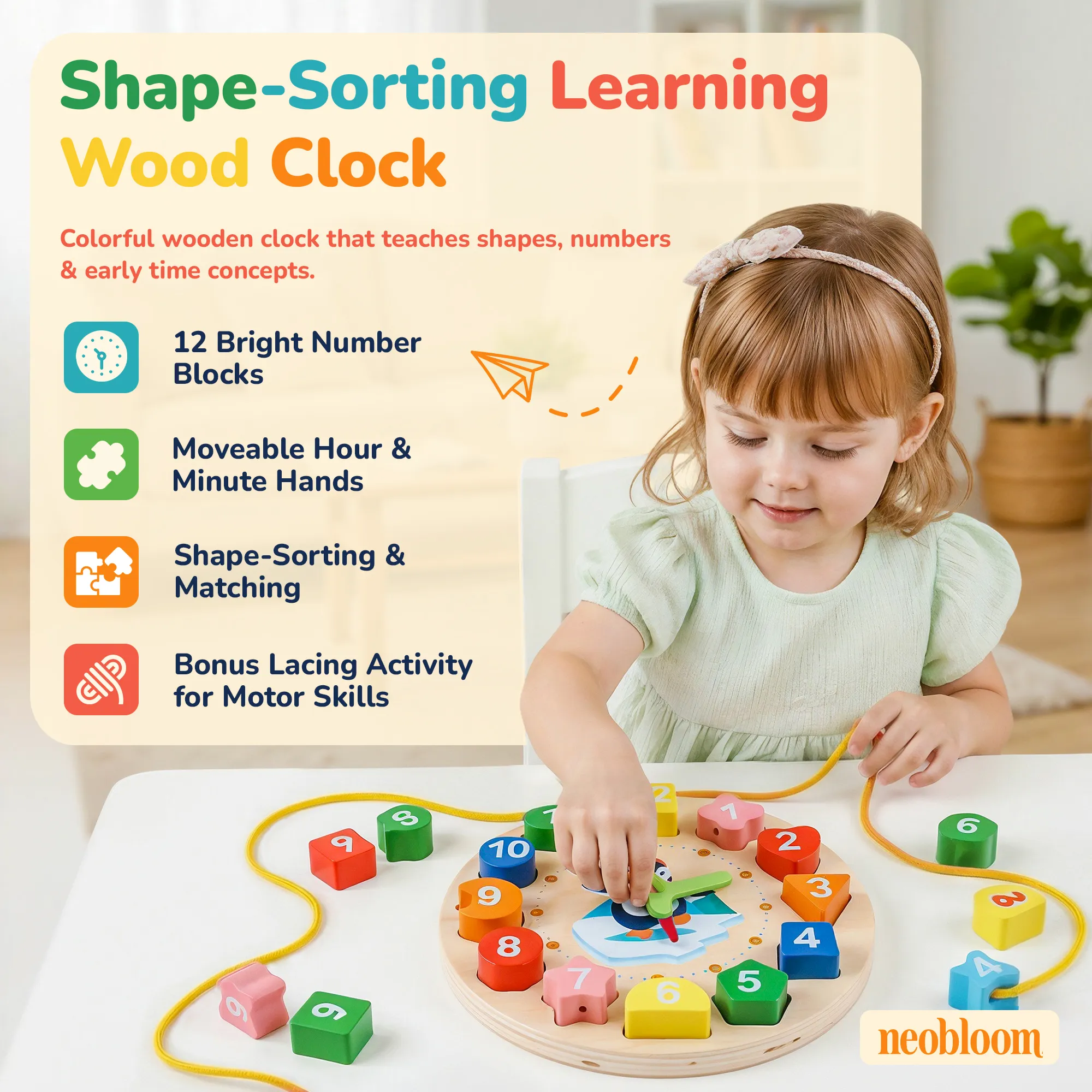 TEACHES KIDS HOW TO READ TIME – The interactive wooden clock board includes movable hands, numbers, and shapes that encourage early math and time-reading skills used in nursery and preschool programs.