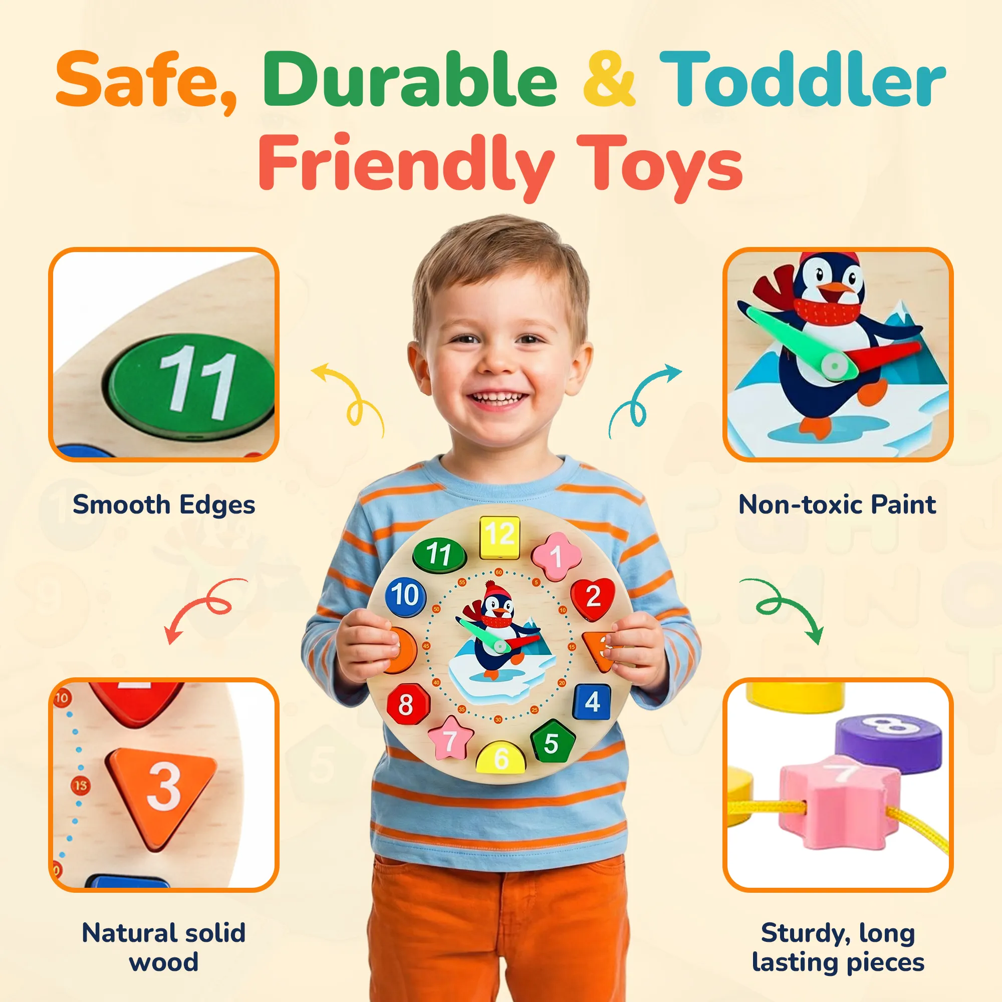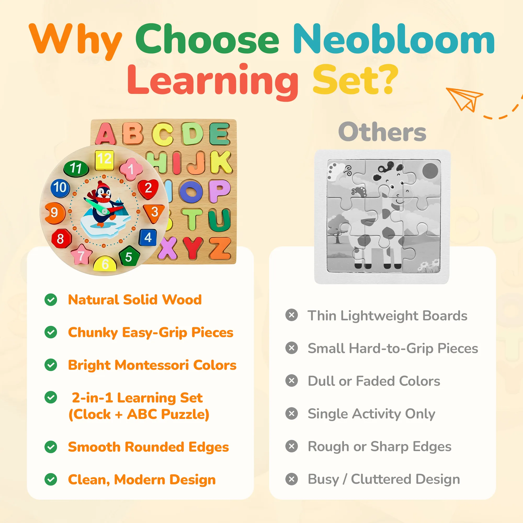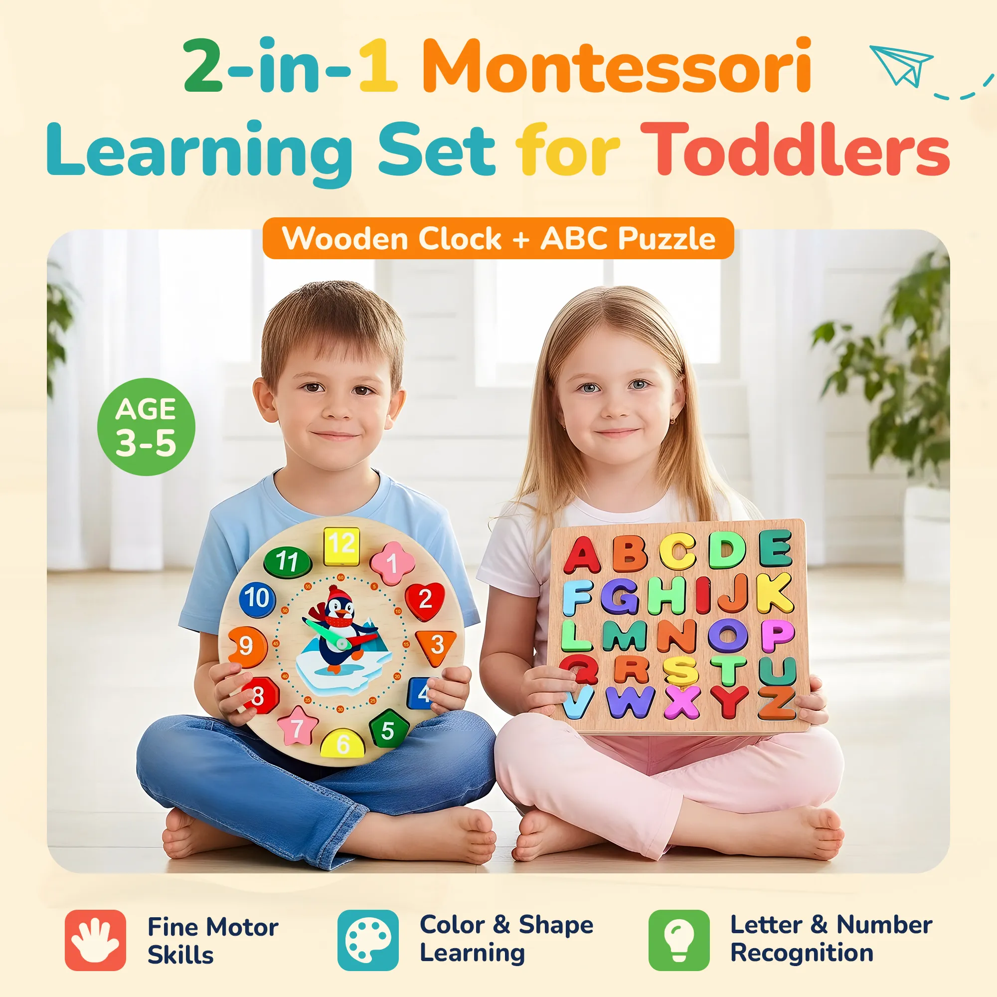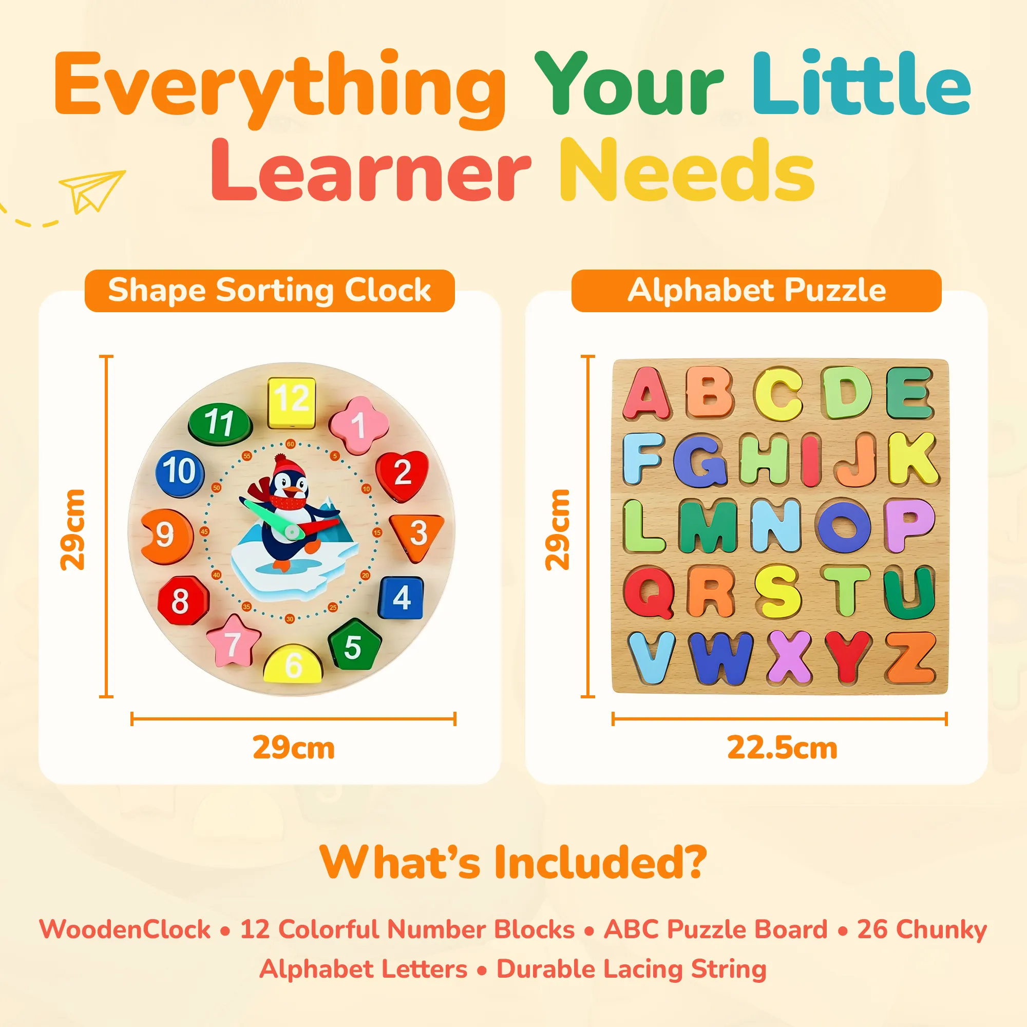 MONTESSORI LEARNING THROUGH PLAY – This 2-in-1 wooden clock + alphabet puzzle kids toy set helps children learn time-telling, ABC letters, shapes, colours, and problem-solving. Perfect for toddlers age 3–5